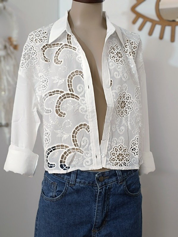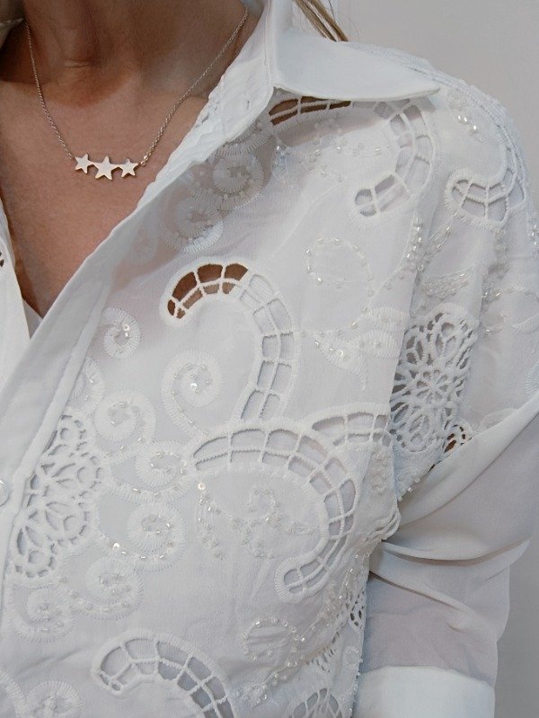 Delicada y fina camisa de mangas largas con detalles en el frente de broderie, bordados y mostacillas.
